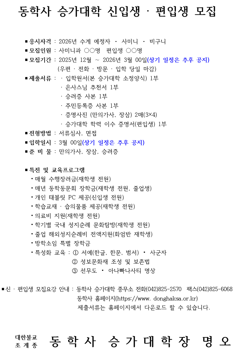 2026년 동학사 승가대학 신입생 · 편입생 모집